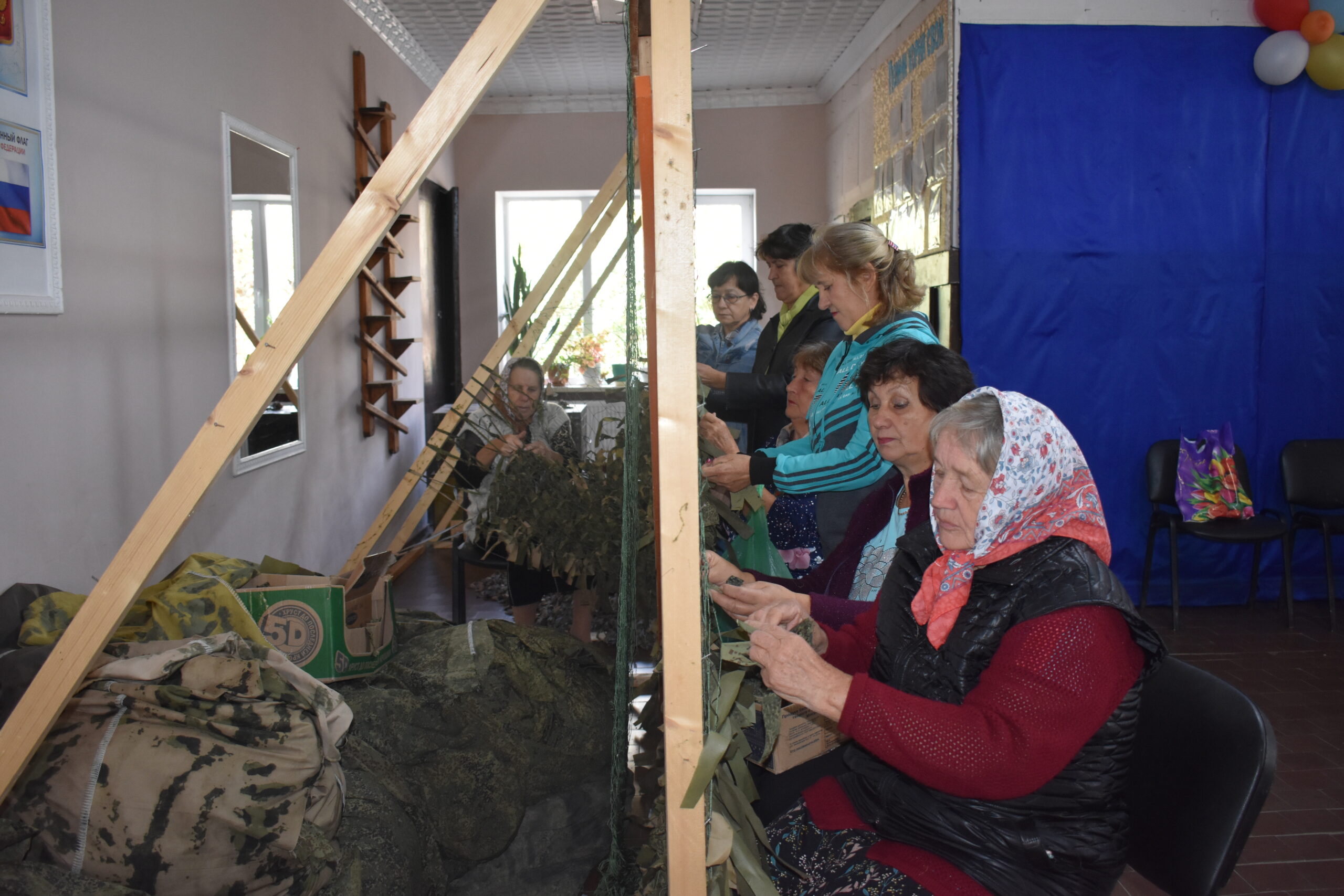 Сегодня «Паучки» базируется в Николаевском сельском Доме культуры, где его директор Людмила Георгиевна Быхалова предоставила место для их работы и станок для плетения маскировочных сетей.
