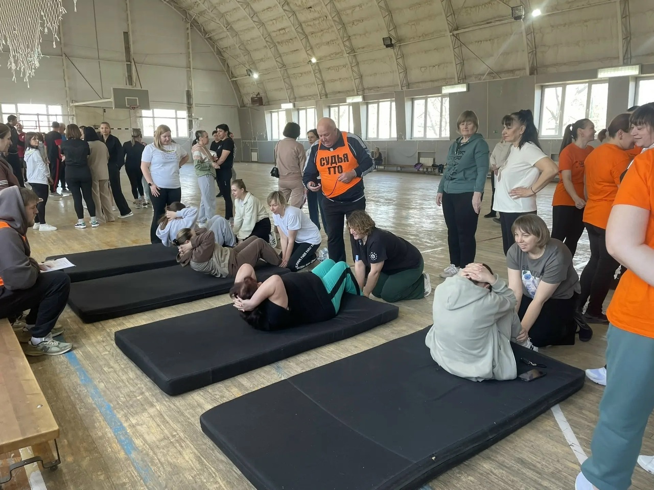 Соревновательная часть включала три испытания: наклон вперед из положения стоя на гимнастической скамье, подъем туловища из положения лежа на спине и сгибание-разгибание рук в упоре. Большинство педагогов также приняли участие в испытаниях вне конкурса, стремясь получить знаки отличия ГТО.