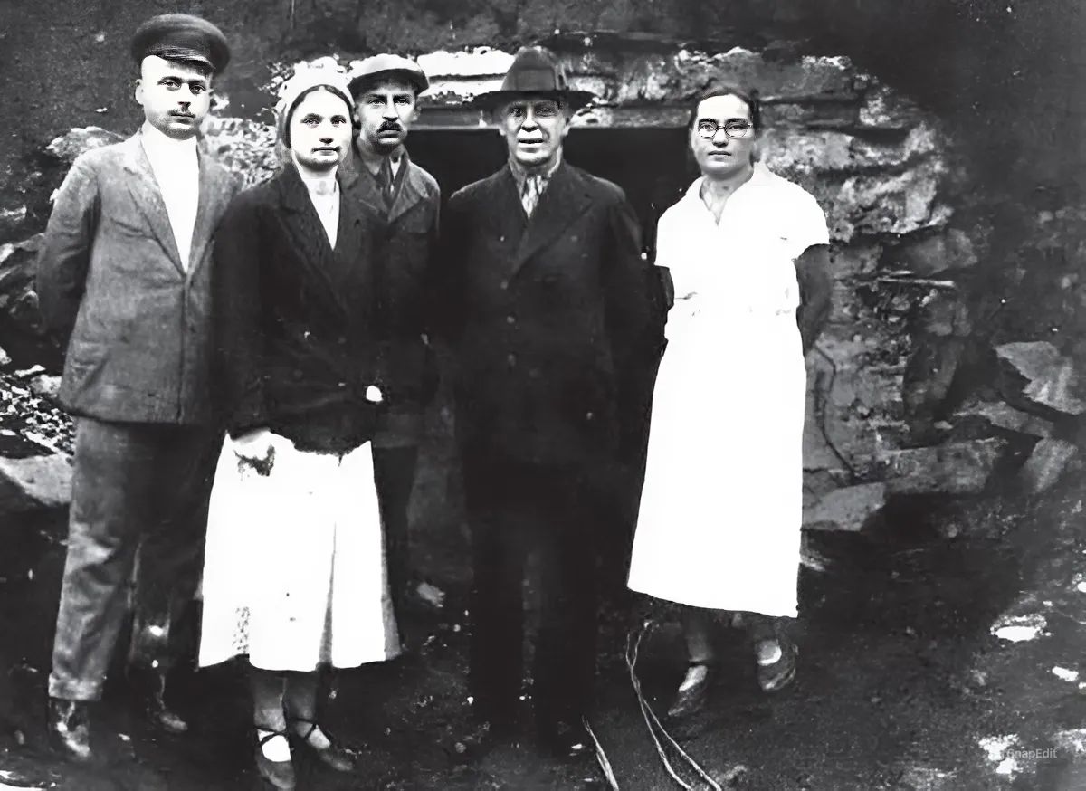 Фото: Ученый и геолог Анна Ксенофонтова у входа в штольню (вторая слева). 1935 год.