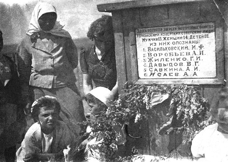 Нелегко давались воспоминания моей собеседнице Л.А. Сухиной. Она не смогла сдержать слез. Чуть успокоившись, показала фотографию. На ней памятник, установленный в 1943 году на месте расстрела (фотография сделана в том же году). Прислонившись к деревянному памятнику, стоит ее мама, а рядом, в панамке, она, семилетняя Лида Воробьева. Чуть поодаль стоит мать расстрелянного А.А.Исаева. На па-мятнике надпись: «Здесь покоятся зверски расстрелянные фашистско-германскими из-вергами советские люди. Мужчин: 13. Женщин: 14. Детей: 18. Из них опознаны: 1. Васильковский И.Ф. 2. Воробьев А.И. 3. Жиленко Г.И. 4. Давыдов В.Г. 5. Савкина А.И. 6. Исаев А.А.».