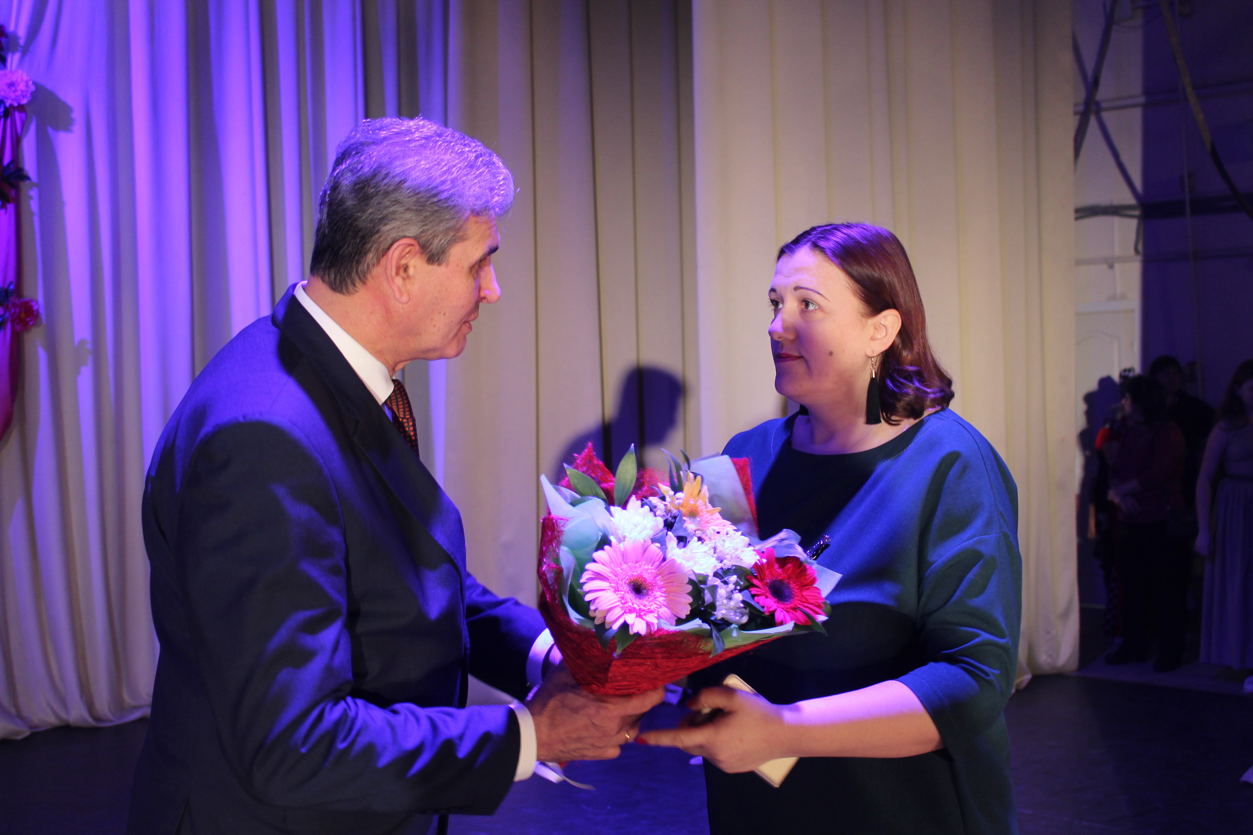 В честь Международного женского дня лучшим представительницам трудовых коллективов, работающим в разных сферах, глава администрации района В.Е.Кал- мыков вручил цветы и ценные подарки.