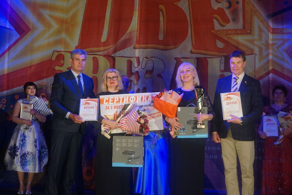 Ну а первое место было заслуженно присуждено нашему дуэту «Струны души» — Елене Коломоец и Татьяне Ивановой. Высокопрофессиональное исполнение никого не оставило равнодушным, и они лидировали практически во всех номинациях. Главным призом победителям стали вокальные радиосистемы.