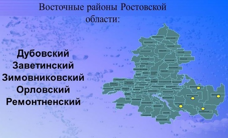 Было отмечено, что районы, расположенные на востоке Ростовской области, отличаются очень сложными климатическими условиями. Для них характерны схожие проблемы, обусловленные климатом и удаленностью от центра, в том числе и от обширных водных ресурсов. Тем не менее, здесь сосредоточено 35% областного поголовья крупного рогатого скота (189 тыс. голов) и 65% мелкого рогатого скота (738 тыс. голов), а также 43% площадей кормовых культур (91 тыс. га). При этом площадь сельхозугодий составляет 22% от общей областной площади (1,9 млн. га).