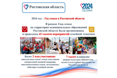 В течение года во всех муниципальных образованиях Дона в рамках проектов «Большие семейные выходные» и «Семейная осень» были организованы культурно-массовые, развлекательные, познавательные, туристические мероприятия, направленные на совместный досуг членов семьи.