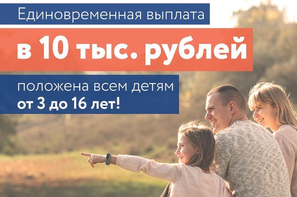 Семьи, воспитывающие детей в возрасте от 3 до 16 лет, имеют право на единовременную выплату в размере 10 тысяч рублей.