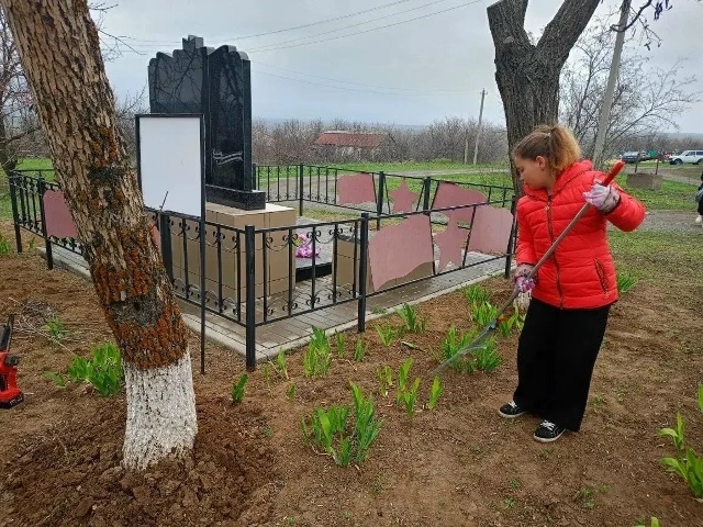 Ребята очистили плитку и дорожки от пыли и сорняков, убрали прошлогоднюю листву и сухие ветки, привели в порядок прилегающую к памятнику территорию.