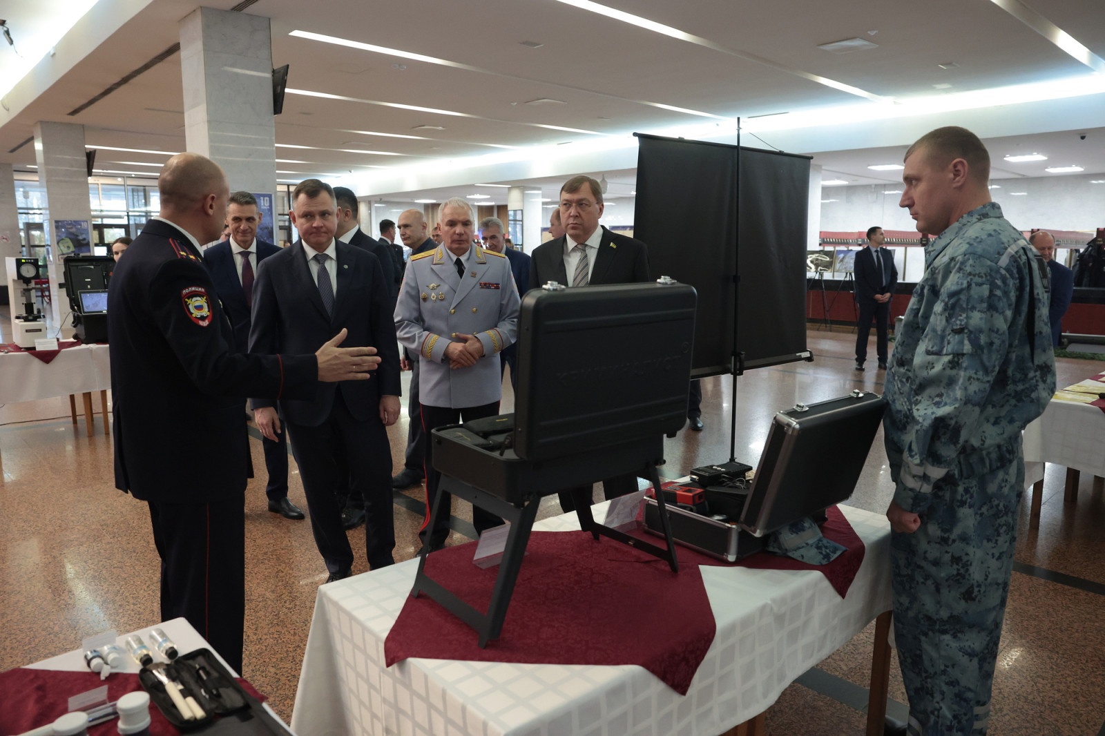 Перед церемонией награждения Юрий Слюсарь ознакомился с выставкой инструментов и методов, используемых сотрудниками правопорядка при раскрытии преступлений.