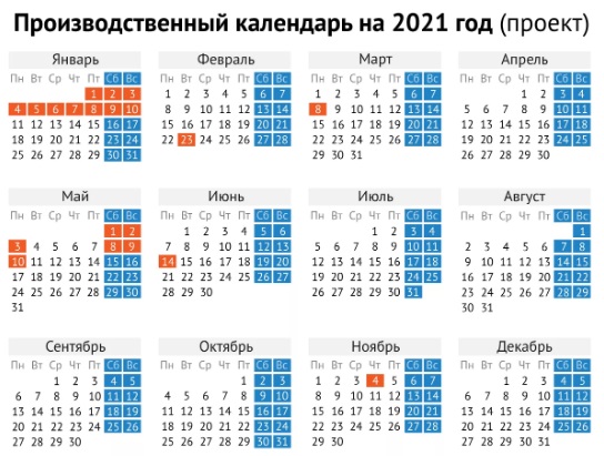 При таком раскладе в 2021 году россияне будут отдыхать по следующему графику: с 1 по 10 января; с 21 по 23 февраля; с 6 по 8 марта; с 1 по 3 мая и с 8 по 10 мая; с 12 по 14 июня; с 4 по 7 ноября; 31 декабря.