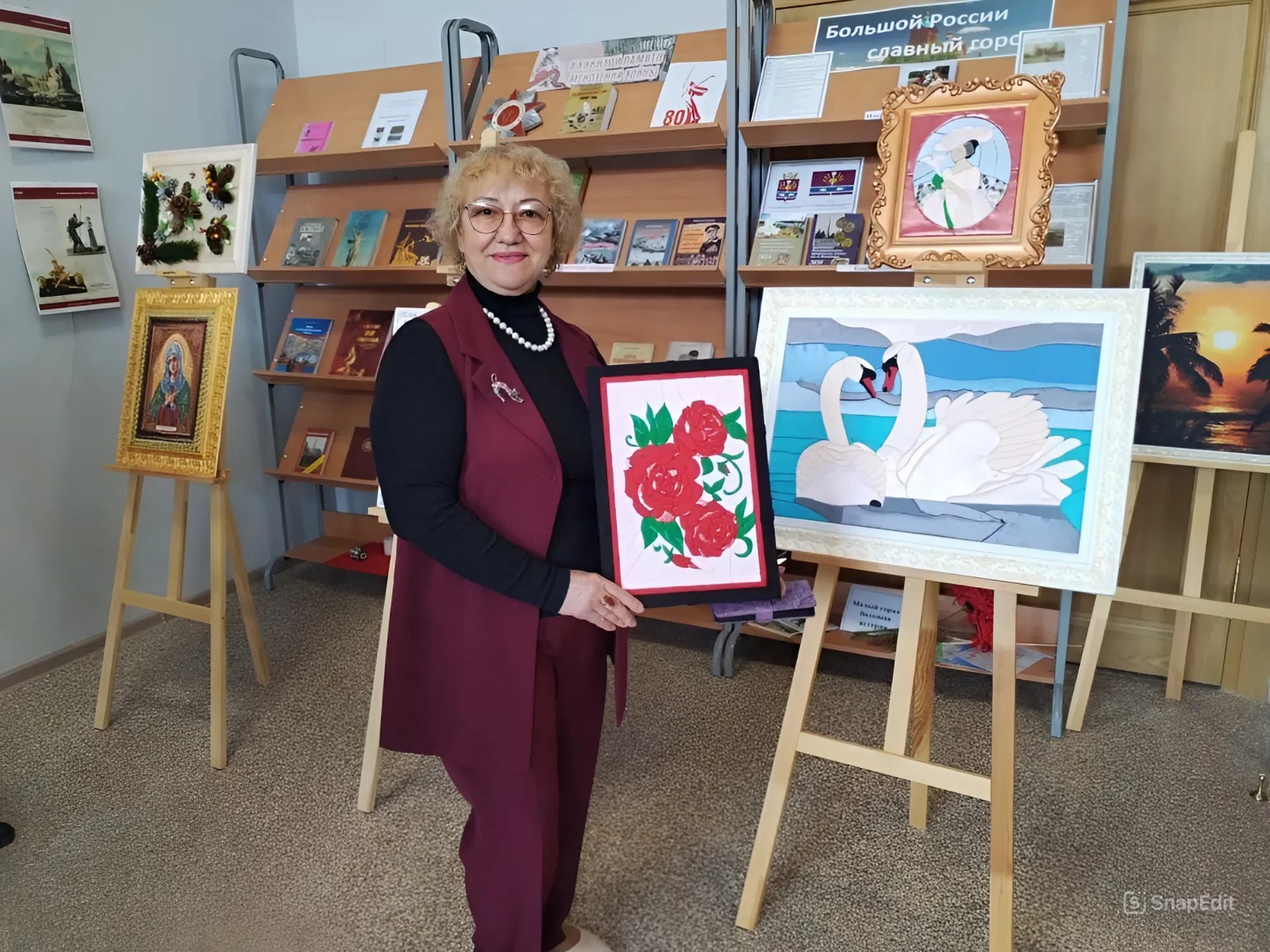 - На выставке представлены работы , выполненные в японской технике «Кинусайга», где картины создаются из лоскутков ткани без использования иголки. Также можно увидеть изделия из бисера и природного материала. Картины Ольги Николаевны отличаются яркостью и оригинальностью, в них чувствуется душа и тепло мастера.