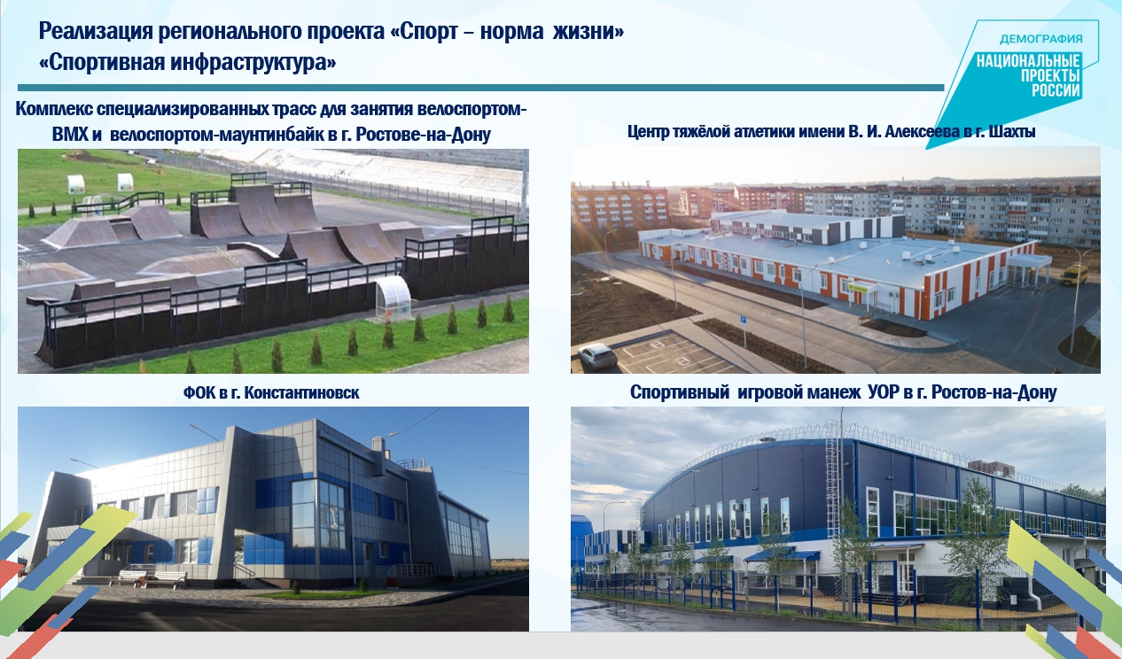 Как проинформировал министр по физической культуре и спорту Ростовской области Самвел Аракелян, за 5 лет на Дону построено и отремонтировано 272 спортивных объекта. В их числе – физкультурно-оздоровительный комплекс в Константиновске, комплекс специализированных трасс для занятий велоспортом ВМХ и маунтинбайк в Ростове-на-Дону, крытый игровой манеж в Ростовском областном училище олимпийского резерва, центр спортивной подготовки по тяжелой атлетике им В.И.Алексеева в Шахтах.
