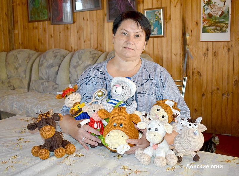 - Все мои работы мне нравятся и трудно выделить, какую то одну, самую — самую. Когда довязываешь игрушку, то уже она для тебя как живая и самая любимая. Ведь вяжешь для детей, чтобы игрушки приносили только радость, — мастерица. — Вот посмотрите, например, на бычков — все они разные. Бычок спортсмен, а этот — романтик, есть бычок — фермер, один веселый, другой добродушный, а этот смотрит на мир с удивлением.
