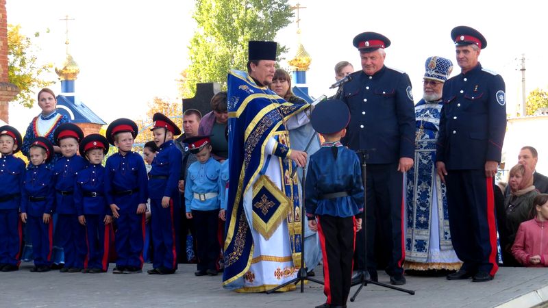 После окончании Литургии и Крестного хода вокруг храма по доброй традиции состоялось посвящение в казачата воспитанников дошкольных образовательных учреждений, имеющих статус «Казачье». И в нынешний праздник полку казаков прибыло ровно на 85 маленьких казачат — воспитанников городских детских садов «Аленушка», «Золотой ключик», «Ладушки», «Солнышко», а также «Виноградинка» (х.Ведерников), «Колосок» (х.Нижнекалинов) и «Колокольчик» (х.Почтовый).