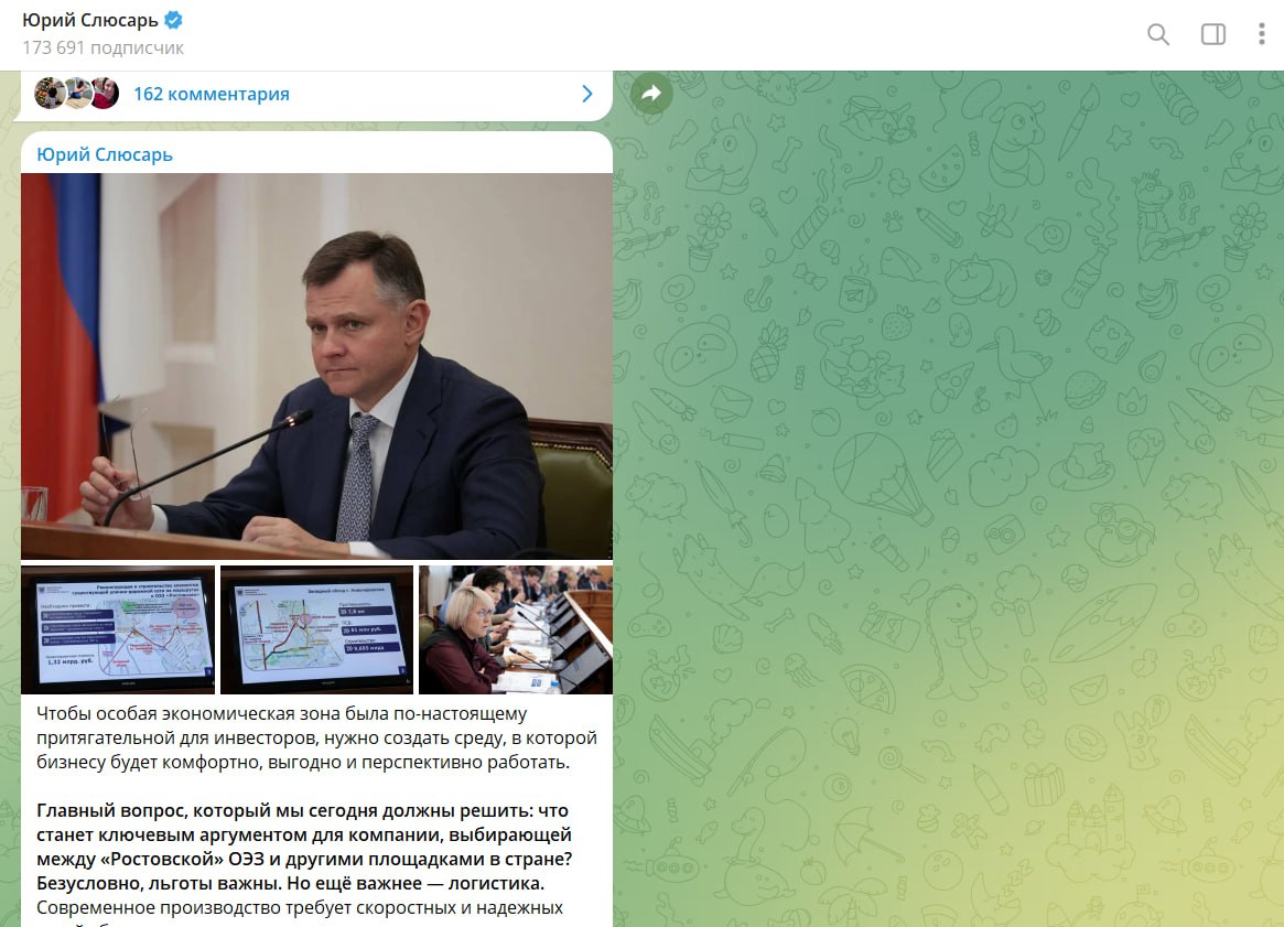Индекс цитируемости канала главы региона составил 290,09. В своем канале Юрий Слюсарь освещает ключевые события, происходящие на Дону.