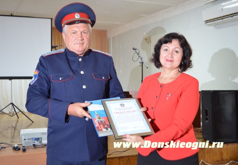 Накануне этого мероприятия департамент по делам казачества и кадетских учебных заведений Ростовской области присвоил педагогическому колледжу статус «Казачье». Свидетельство о присвоении статуса директору колледжа А.Н.Никитиной торжественно вручил атаман городского казачьего общества «Станица Константиновская» А.П.Денисов.