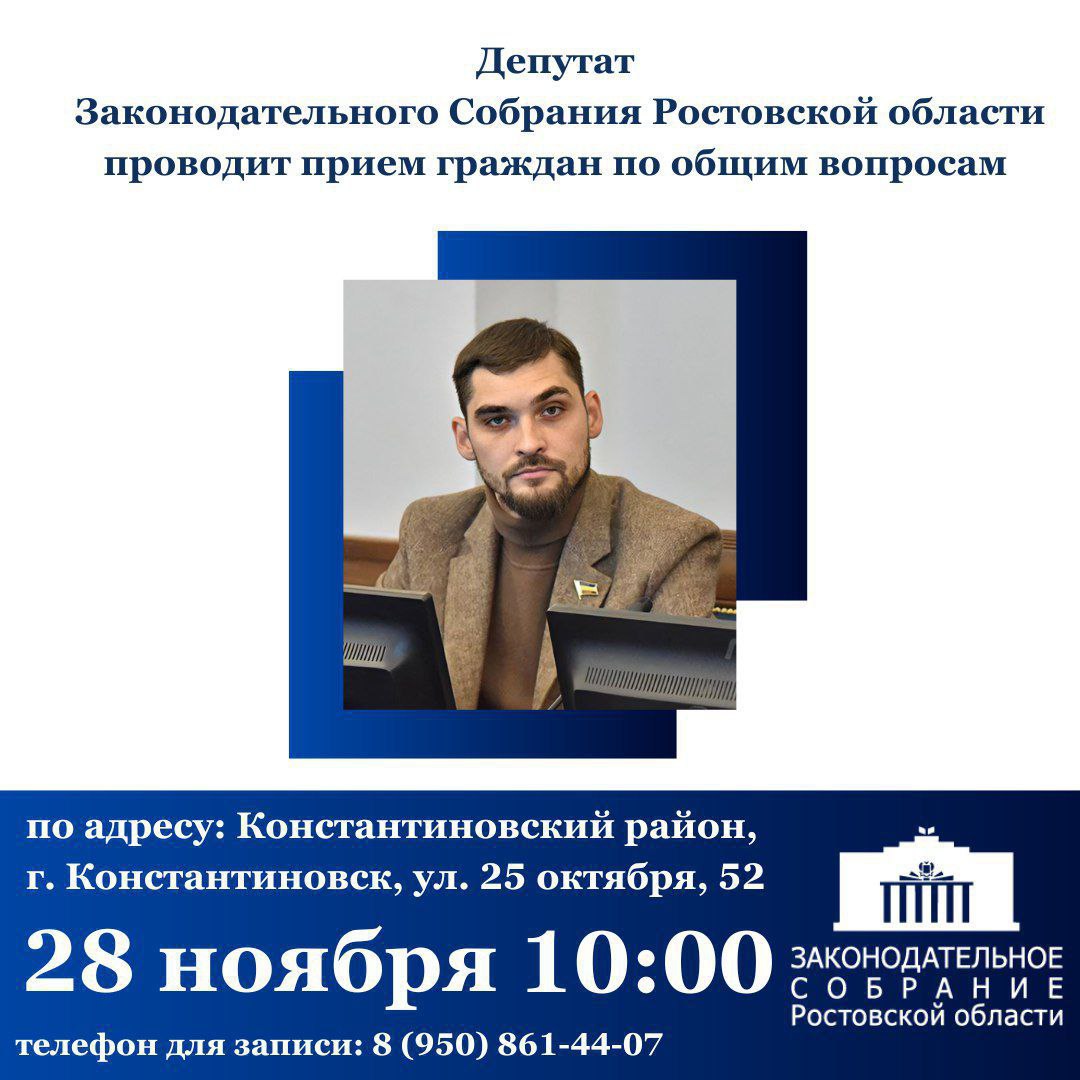 В Константиновске 28 ноября депутат Законодательного собрания Ростовской области проведет прием граждан по общим вопросам.