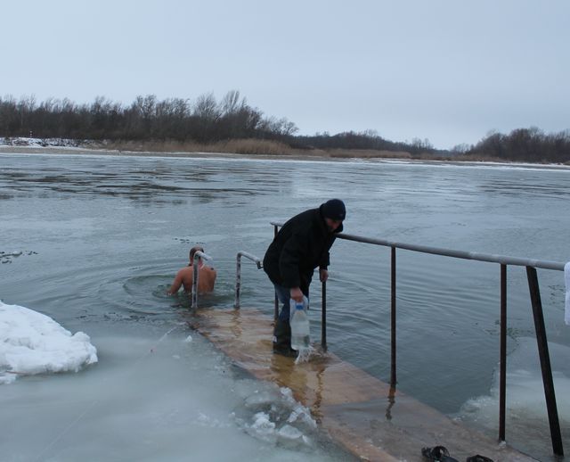 Многие, несмотря на холодную, ветреную погоду, по замечательному обычаю окунались в ледяную воду Дона, крестясь во имя Отца и Сына, и Святого Духа.