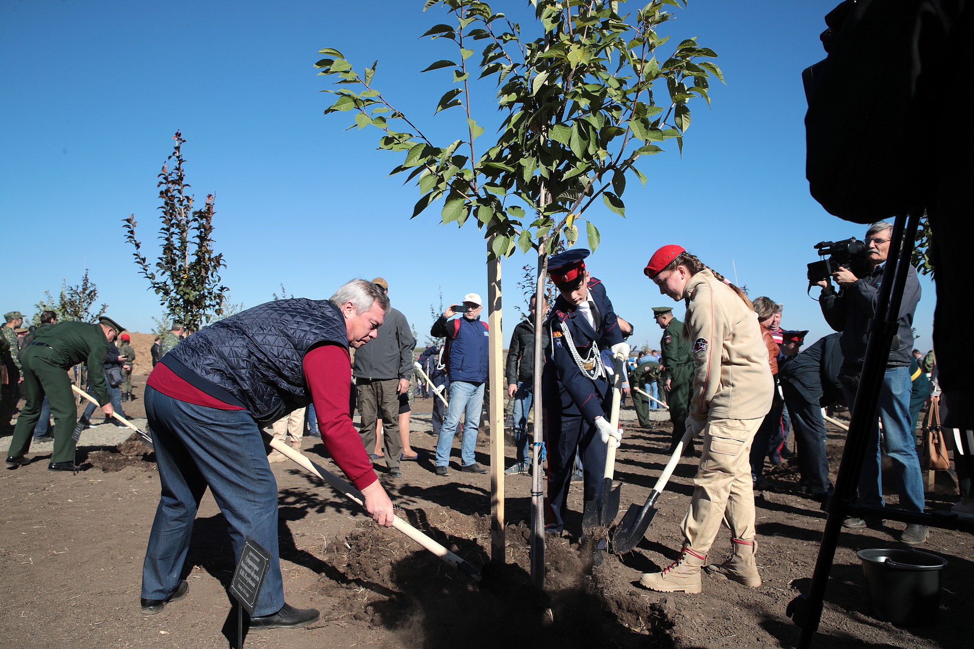 — Здесь, в посадке сада, участвуют представители студенческих строительных отрядов из 74 российских регионов, собравшиеся на Всероссийский слет, который отрывается сегодня в Ростове-на-Дону. Пройдут годы, и вы, молодые люди, будете приходить сюда с детьми, будете рассказывать о той страшной войне и, надеюсь, никогда не забудете тех, кто принес нам Победу, — сказал В.Ю. Голубев.